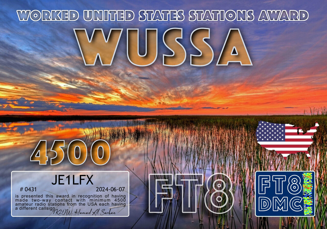 FT8でアメリカの異なる4500局と交信すると受賞できるWUSSA-4500 Awardが届いた。