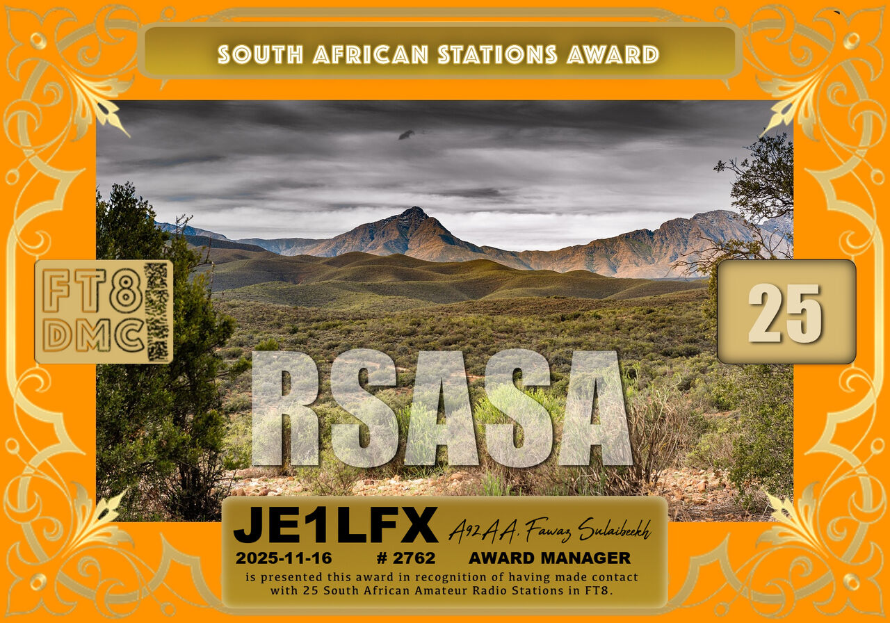 FT8で25局の南アフリカ共和国のアマチュア無線局と交信すると受賞できるRSASA-25 Awardが届